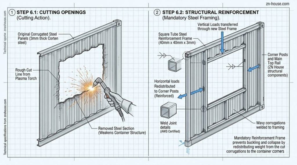 Every incision on the container means that you take out part of the container’s corrugated wall. However, the corrugated wall helps a lot in making the container a strong and sturdy shelter. So, if you make large enough openings, especially on the walls that carry the load or on containers that are stacked, then you have to reinforce them with steel frames, headers, and posts to be able to transfer the loads around the opening. If you use the wrong tools, cut too much, or don’t do reinforcement, then it can cause the deformation of the container, welding cracks, and in some cases, even structural failures can occur.
